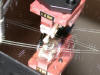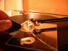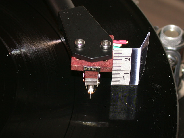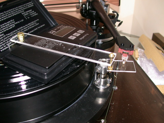 Ora, è solo il caso di ricordare che esistono una miriade di tecniche per la regolazione fine di un giradischi e, chi più, chi meno, sono tutte rivolte ad ottenere lo stesso risultato: guidare lo stilo all'interno del solco nella maniera più lineare possibile, ove lineare deve essere inteso come "affetto dal minore errore possibile". Nella fattispecie mi sono servito dei tools di Wally Malewicz che ho avuto modo di conoscere in passato. Mettiamoci all'opera Una volta installata la testina senza badare alla geometria, mi sono servito di una bilancina di precisione allo 0,00 grammi per pesare la VTF ad un livello medio rispetto a quello suggerito dalla casa. Per evitare errori di sfasamento, ho utilizzato una "protesi" che consentisse di misurare la VTF esattamente a livello del disco quando solitamente la misura viene fatta ad una altezza superiore (spessore bilancia). Una volta tarata la bilancia ho quindi settato la VTF a 1.42 grammi (range 1.35 - 1.50):
