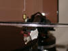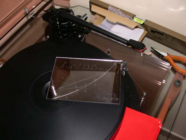 Rimontata sul braccio la testina dopo avere annotato le due regolazioni di VTA per dischi leggeri e spessi (200g) sono passato alla fase più delicata ovvero la regolazione della HTA e della geometria di tracciamento del braccio. Per fare ciò mi sono servito di una dima appositamente creata per il mio braccio (ovvero per tutti i bracci che abbiano uguale lunghezza effettiva) fatta in puro specchio inciso: Servendomi di una lente di ingrandimento per evitare errori di parallasse ho regolato la geometria della testina in modo che le rispondesse un overhang ottimale scegliendo la scala di allineamento Barwald ed in modo da individuare con precisione i due punti in cui l'errore di tangenza si deve annullare. La dima in questione consente anche di inquadrare il giusto posizionamento del cantilever rispetto allo stilo nei punti di annullamento. Infine ho provveduto a regolare l'antiskating utilizzando il calcolo in percentuale rispetto alla VTF anzichè in grammi: